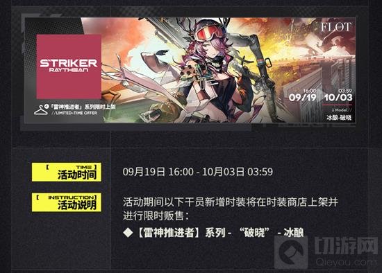 活动期间,【雷神推进者】系列时装之一——「冰酿-破晓」将在时装商店限时上架,供各位刀客塔购买。