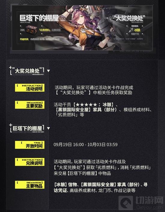 在「巨塔下的棚屋」中,玩家可以使用「劣质燃料」兑换各类奖励,包括但不限于活动干员【★★★★★冰酿】的信物、「黑钢国际安全屋」家具(部分)、寻访凭证、高级养成素材、龙门币、作战记录等。