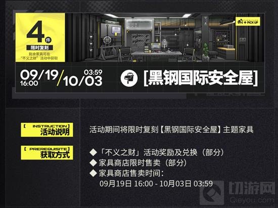 【黑钢国际安全屋】主题家具将限时复刻,部分家具可通过「不义之财」活动奖励及兑换获得,其余家具将在家具商店限时售卖。