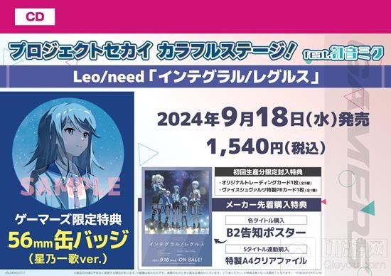 世界计划Leo/need第九张单曲专辑《インテグラル/レグルス》(Integral/Regulus)今日发售,只设通常盘一种规格,定价为1540日元(含税)。