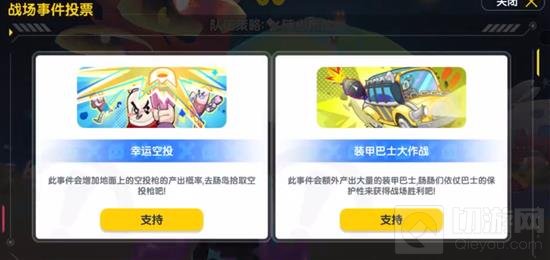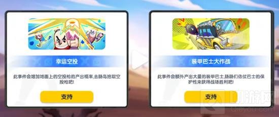 幸运空投事件,装甲巴士是大作战事件,这两个事件可以让信号枪以及专打巴士在地图中的产出大大提升,复活灾战事件可以让开局五分钟内被淘汰的场景常常们复活到队友身边,自动拾取复活币事件可以让常常们自动获得被淘汰队友的复活币,直接使用复活机器或平行卡复活队友。