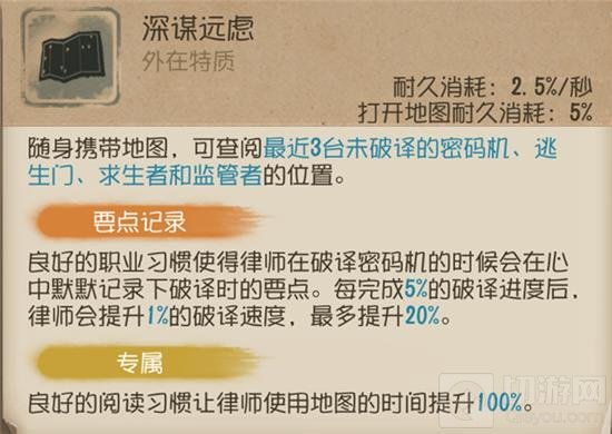 深谋远虑:律师可以利用地图来获取场上信息,包括监管者的位置和密码机的破译进度。这种能力使得律师在游戏开始时就能做出战略性的决策,比如选择远离监管者的密码机进行破译,或者预判监管者的行动路线。