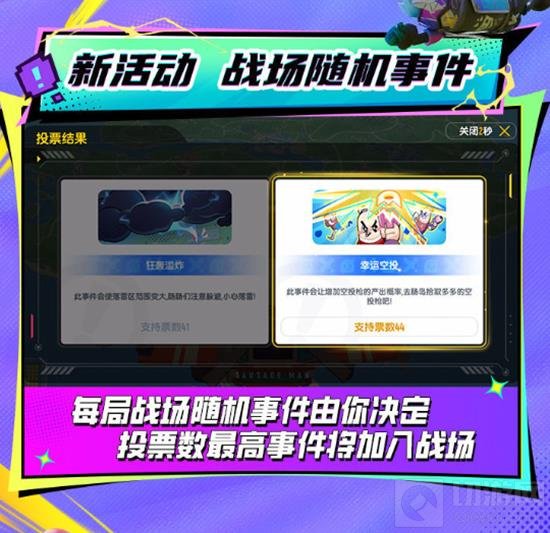 (1)经典模式对局中,将会出现「战场随机事件」,肠肠们可以在「出生岛」时对喜欢的事件进行投票,在起飞阶段公布投票结果,投票最高的事件将成为本局战斗的「随机事件」;