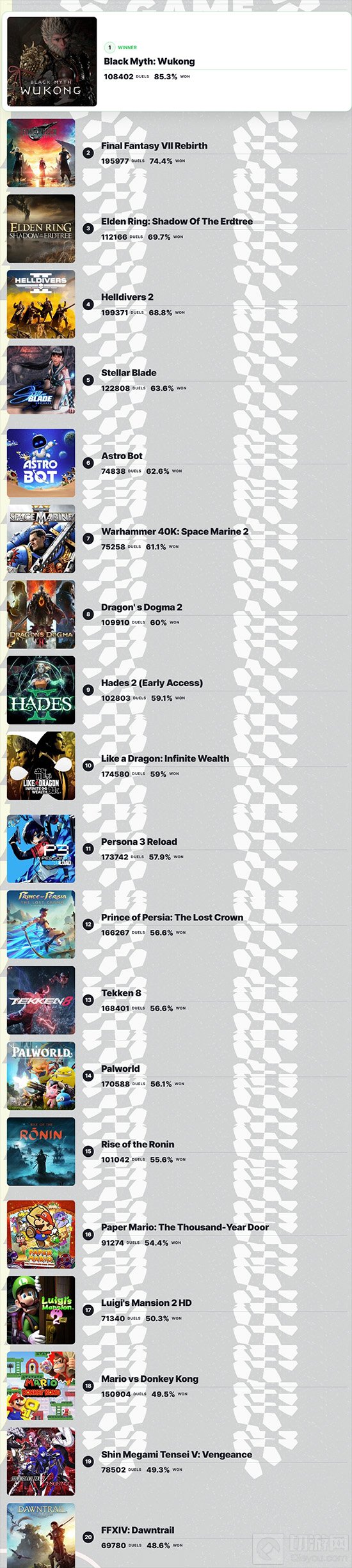 值得一提的是,IGN的这次投票是基于其数据库中的82款游戏进行的,通过随机配对让玩家在两款游戏中做出选择。《黑神话:悟空》从最初的第四名稳步攀升至第一名,这充分展示了玩家们对这款游戏的高度认可和期待。