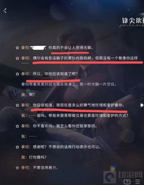 游戏内被指控抄袭的文段如上图所示。被标注的文段是游戏内的角色【秦彻】的剧情台词。这些台词与国外的某漫画作品的中文译本(非官方翻译)中的一些台词相近,因此有部分人认为游戏的文案抄袭了该漫画。