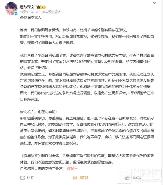 游戏官方于今日上午发布声明。制作组认为,基于当前证据和整体内容的原创性,无法认定这句台词存在问题,但是出于不希望这句台词以及相关争议的存在,持续影响大家的游戏体验,表示仍将对台词进行修改。修改将在今日稍晚时候进行并完成。
