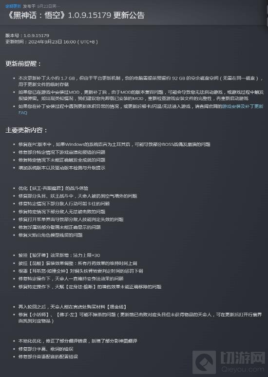 以上就是黑神话悟空游戏更新内容了,如果你想获取更多的游戏资讯,关注切游网,小编带你看更多的游戏内容!