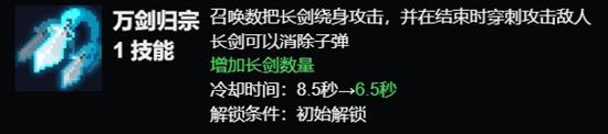 万剑归宗:这个技能可以召唤数把长剑围绕玩家攻击敌人,并在结束时对敌人进行穿刺攻击。长剑可以消除子弹,增加玩家的防御能力。技能的冷却时间为8.5秒,五星升级后冷却时间缩短至6.5秒。