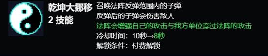 乾坤大挪移:这个技能允许玩家召唤一个法阵,反弹范围内的子弹并对敌人造成伤害。法阵同时增强玩家和友军的攻击力。技能冷却时间为10秒,五星升级后缩短至8秒。