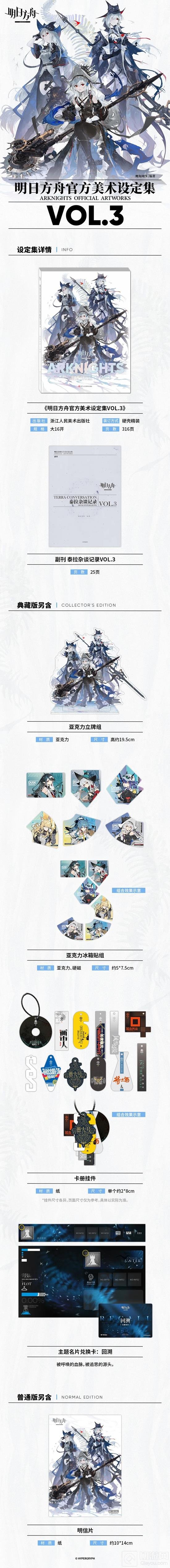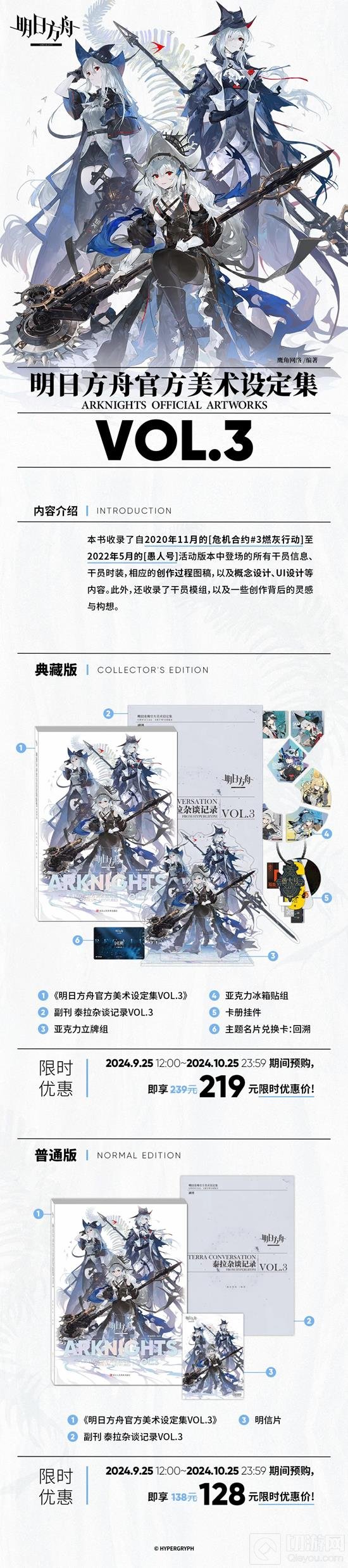 《明日方舟》官方美术设定集第三卷将于2024年9月25日中午12点正式开售。本设定集汇集了从2020年11月的“危机合约#3燃灰行动”至2022年5月的“愚人号”活动的所有干员资料、时装、创作过程图稿、概念设计和UI设计等内容。