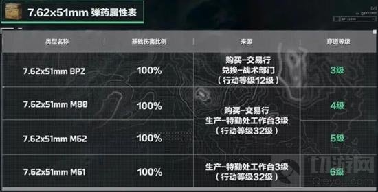 7.62x51mm弹药根据穿透等级的不同,分为四种类型:BPZ、M80、M62和M61。其中,BPZ为3级弹药,可以通过交易行购买,达到10级后,玩家还可以在战术部门用收集到的秘密笔记本和酒店宣传海报进行兑换。M80和M62则分别为4级和5级弹药,除了可以在交易行购买外,玩家还可以通过工作台进行生产。最后,M61作为6级弹药,是一种特殊的武器,仅能在工作台生产,具有极强的护甲伤害能力,对1至6级护甲造成120%的伤害,尽管其制造成本较高,但在合适的情况下,绝对值得投资。