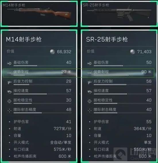 最后,在精准射手步枪方面,SR-25和M14则分别展现出不同的优势。SR-25的优势射程达到惊人的90米,尽管其为半自动射击模式,但凭借良好的枪身稳定性和高护甲/基础伤害,在远程作战中具有强大的爆发力。相对而言,M14的优势射程为27米,凭借其高腰际射击精度和全自动射击模式,在近战中能够迅速化身为强力武器,以727发每分钟的射速给敌人带来沉重打击。