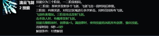 流云飞剑:这是剑宗的二技能,它具有大范围、高伤害、短冷却时间、穿墙和消弹等优点。这个技能在游戏中几乎所有模式中都有很好的表现,被认为是当前最强的技能之一。