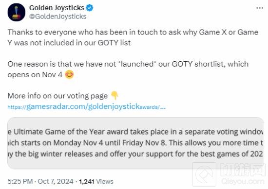 尽管如此,金摇杆奖的提名过程仍然在进行中,玩家可以通过投票来表达他们对游戏的支持。投票环节已经开始,并将持续至11月1日。最终的颁奖典礼定于11月21日举行,届时将揭晓所有奖项的获奖者。
