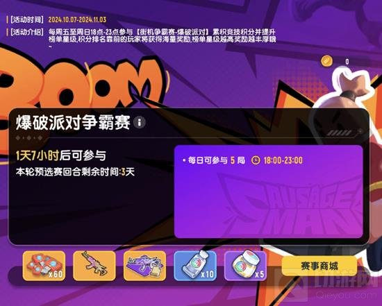 活动期间,每周五至周日的18:00至23:00,玩家可以参与比赛,累积竞技积分。根据竞技积分,玩家将被分配到不同星级的榜单,榜单星级越高,奖励越丰厚。如果小伙伴们对爆破派对不熟悉,可以参考小编整理的爆破派对介绍,点击传送门即可跳转。