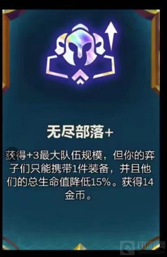 获得+3最大队伍规模,但你的弈子们只能携带1件装备,并且他们的总生命值降低15%。获得14金币。