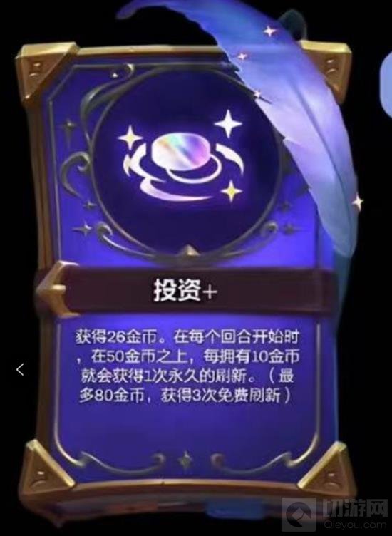 获得26金币。在每个回合开始时在50金币之上,每拥有10金币就会获得1次永久的晟新。(最多80金币,获得3次免费刷新)