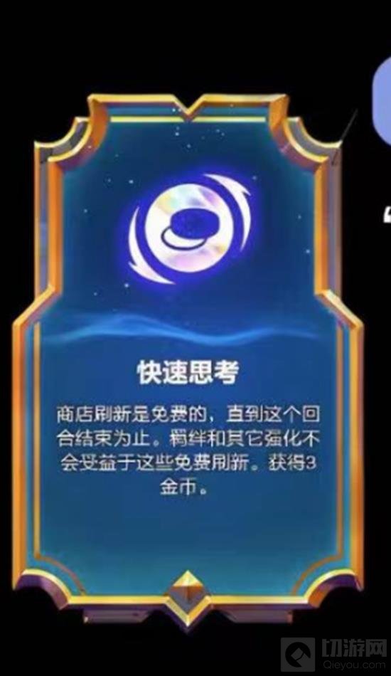 注意:这个回合结束”指:快速思考新是免费的,直到这个一直到本轮【强化符文】选择时间结束。即:从这轮【强化符文】出现开始计时45秒内,刷新是免费的。小伙伴选择这个符文,手速务必要快!