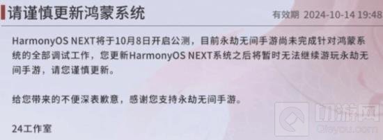 对于游戏《永劫无间》的玩家们,官方已经发出通知,提醒用户目前该游戏尚未完成对HarmonyOS NEXT的全部调试工作。因此,如果用户选择更新到HarmonyOS NEXT,他们将暂时无法游玩《永劫无间》手游。
