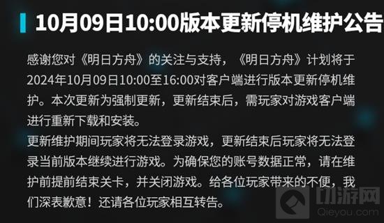 《明日方舟》官方宣布将在2024年10月9日进行一次大规模的版本更新,此次更新将带来全新的游戏体验,包括限时活动、新干员资料以及多项游戏内优化。随着这次更新的到来,玩家将能够探索更多精彩内容,同时享受更加流畅的游戏体验。