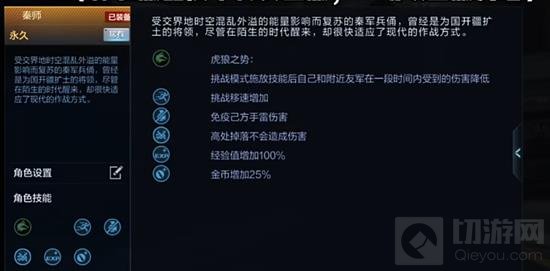 挑战模式专属技能“虎狼之势”:在挑战模式中,秦师可以释放“虎狼之势”技能,短时间内减少自身和附近友军受到的伤害,并提升移动速度。