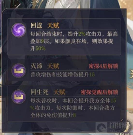 2星解锁:每回合结束后,提升2%攻击力,最高叠加9层。有颜良在场时,效果提升50%。