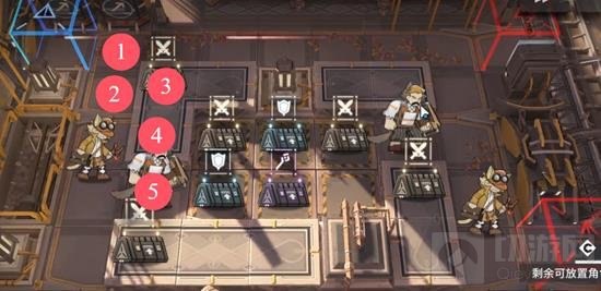 如图所示,按照1-5的顺序分别部署先锋、近卫(朝下)、术师(朝右,多憋一点费用再上场)、医疗(群奶,朝上)、重装(用来扛伤害)。事后可以看情况找个近卫换掉最开始的先锋位。之后一路挂机即可通关。期间敌人会把其他装备抢走以获得加强,要多注意。