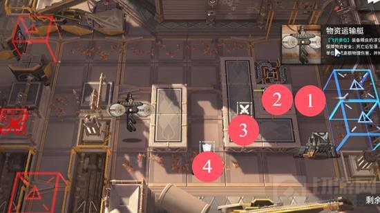如图所示,按照1-4的顺序分别部署近卫、狙击(朝上)、狙击(朝左)、重装,之后可以在(2)的下方一格补群奶(朝左)以方便大家回血。如果输出不够,则在放置(3)号位置的狙击上方一格,再补一个狙击,朝左。一定要记得左路的重装最后上场。