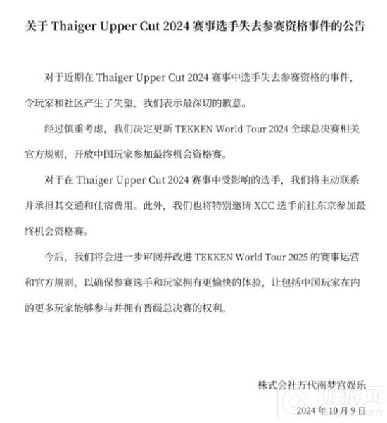 对于在Thaiger Upper Cut 2024赛事中受到影响的中国选手,万代南梦宫将主动联系他们,并承担他们的交通和住宿费用。这一补偿措施体现了万代南梦宫对于受影响选手的关怀和支持。