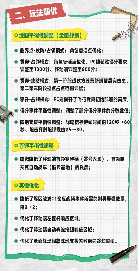 为了确保玩家们能够享受到更加公平和流畅的游戏体验,《三角洲行动》的开发团队对游戏进行了一系列的平衡性调整和优化。包括地图的复活点、得分事件、阵地支援等进行了优化,同时降低了移动端首领的强度,以减少移动端玩家的负担。此外,还降低了触发战场事件所需的导弹数量,并对移动端的操作进行了优化,以提升整体的游戏体验。具体调整优化看下图: