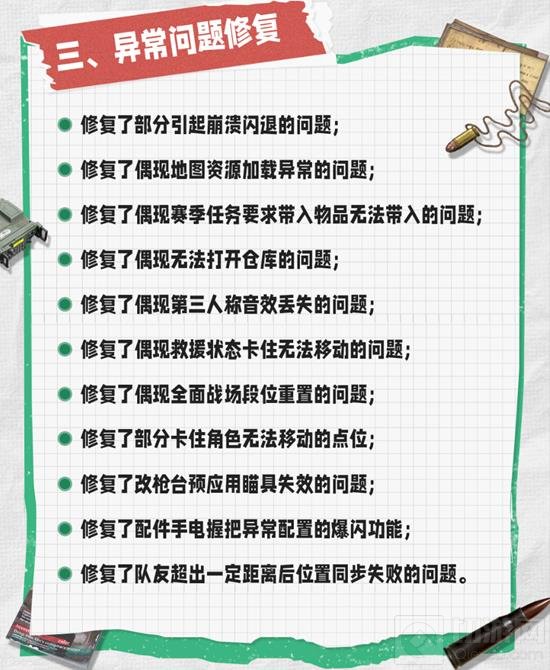 在本次更新中,开发团队还特别关注了游戏的稳定性问题。修复了包括崩溃闪退、地图资源加载异常、任务要求物品带入问题等多个异常问题,确保玩家们能够享受到更加稳定和流畅的游戏体验。