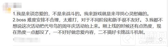 也有玩家总结的很中肯:1.我是来谈恋爱的,不是来战斗的。我来游戏就是来寻找心灵慰藉的。2.boss难度安排不合理,太难打,对于不同阶段和新手很不友好。3.我都不想说这次活动把代号鸟的周年庆活动抬上来。刚上线的时候还有点热度,现在热度一点都没了,一不好好做恋爱内容,二不搞好卡牌战斗机制。