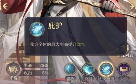 队长技能:【庇护】,提升我方全体的最大生命20%。