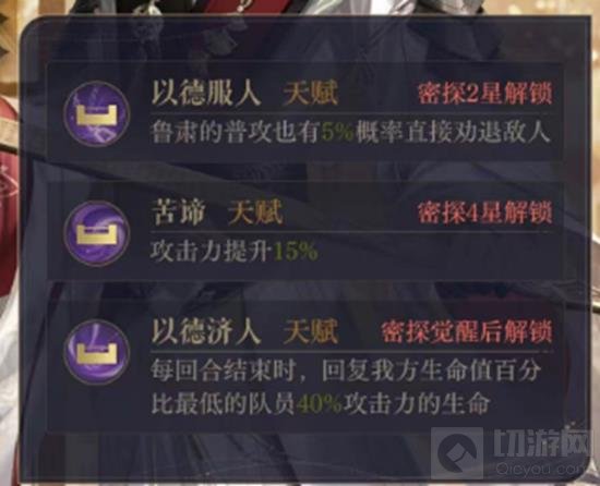 解析:普通的劝退几率小的可怜,但也聊胜于无,大家反正不用放在心上就好了,反正小编还一次没劝退过,但它的恢复生命值天赋确实很好用,可以搭配颜良这样的密探,阵容既好成型,也有一定坦度。可以说鲁肃的天赋决定了他的上限还是蛮高的。