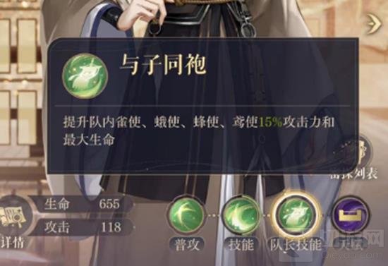 队长技能【与子同袍】:提升队内雀使、蛾使、蜂使、鸢使15%攻击力和最大生命。