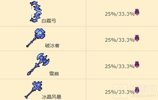 武器:包括白霜弓、破冰者、雪崩和冰晶风暴,每种武器都有不同的掉率。
