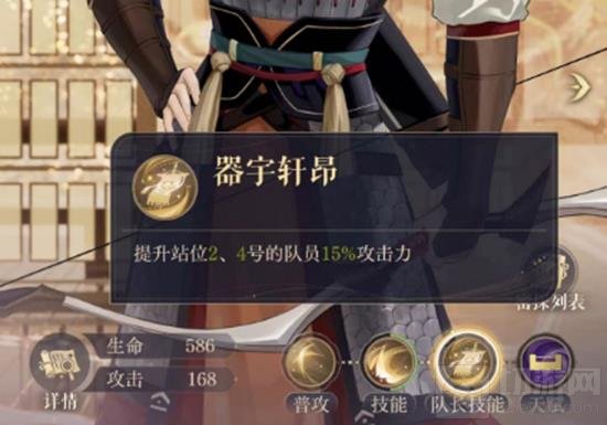 队长技能:器宇轩昂-提升站位2、4号的队员115%攻击力。