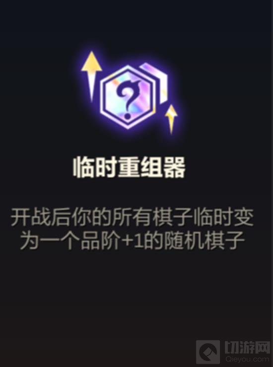 在《金铲铲之战》中,“临时重组器”是一个强化符文,能够将棋盘上的棋子随机变为更高一费的任意棋子,从而提升阵容的强度。
