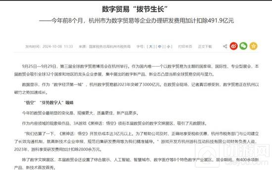 游戏科学互动科技有限公司财务负责人表示:《黑神话:悟空》开发总成本估算达3亿元以上。杭州市税务部门与公司建立了长效沟通机制,游科2023年享受研发费用加计扣除2800余万元。