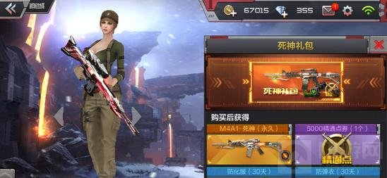 礼包内包括:M4A1死神(永久)、5000精通点、防化服(30天)、防弹衣(30天)