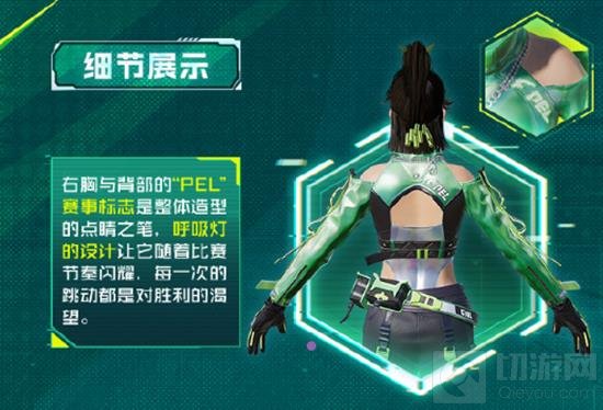 右胸与背部的“PEL”赛事标志是整体造型的点晴之笔,呼吸灯的设计让它随着比赛节秦闪耀,每一次的跳动都是对胜利的渴望。