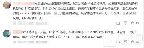 也有玩家认为游戏通过奖励设定有问题:“六级精密匣子只能开出来7个鸟笼,也就是我得打出来20个六级精密匣子才能开一个男主剧情,刚才15个钉钉乐下去就拿了这一个匣子。”