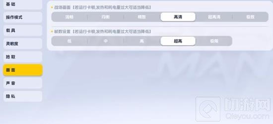 找到“战场画面”设置,我们可以看见画面有“极致”或“高清”,小编建议优先选择高清,