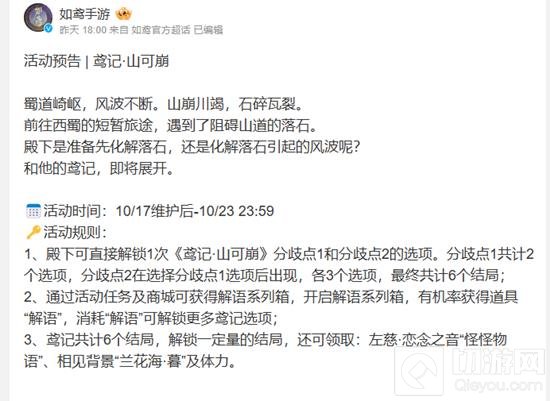 以上就是如鸢微博发布鸢记山可崩活动预告,评论却被冲烂的全部内容了,更多游戏内容,资讯,敬请关注切游网!您的支持是我们努力的动力!