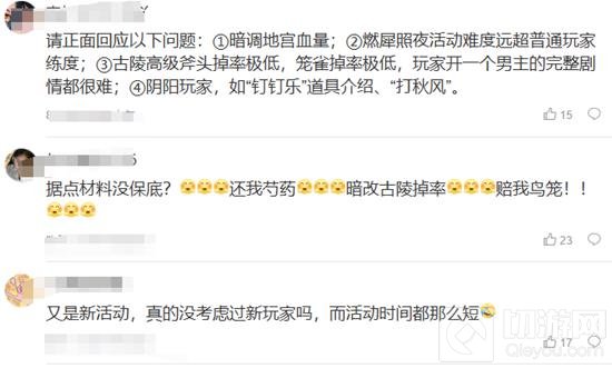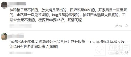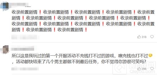 也有玩家调侃:"以这是我玩过的第一个开服活动不充钱打不过的游戏,噢充钱也打不过,活动都快结束了几个男主都做不到最后任务,你不觉得你游很可笑吗?"