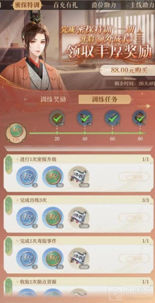 一次历练能获取200经验值,获取材料用于密探升级,体力足够可放心刷,体力不够选择性刷。当然也可以购买体力刷。