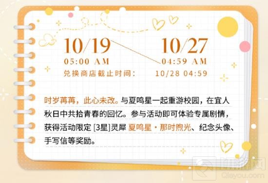 活动说明:时岁苒苒,此心未改。与夏鸣星一起重游校园,在宜人秋日中共拾青春的回忆。参与活动即可体验专属剧情,获得活动限定[3星]灵犀夏鸣星・那时煦光、纪念头像、手写信等奖励。
