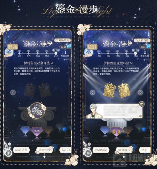 活动期间将开启[鎏金漫步]签到玩法,于时间之海中漫步撷珍,欣赏馆藏珠宝。每日可点亮1次璀璨珠宝,点亮后可领取小熊星座与商店兑换道具[琳琅宝箱]。累计签到达到指定天数后,还可额外领取北极星、纪念徽章、[琳琅宝箱]与纪念道具[鎏金纪念册]。