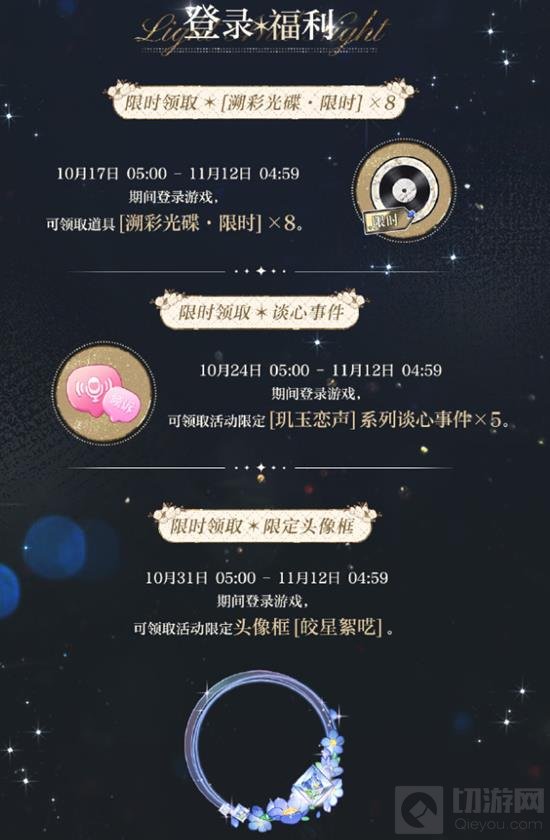 在指定时间内登录游戏,即可领取[溯彩光碟・限时]×8、活动限定[玑玉恋声]系列谈心事件×5与活动限定头像框[皎星絮呓]。