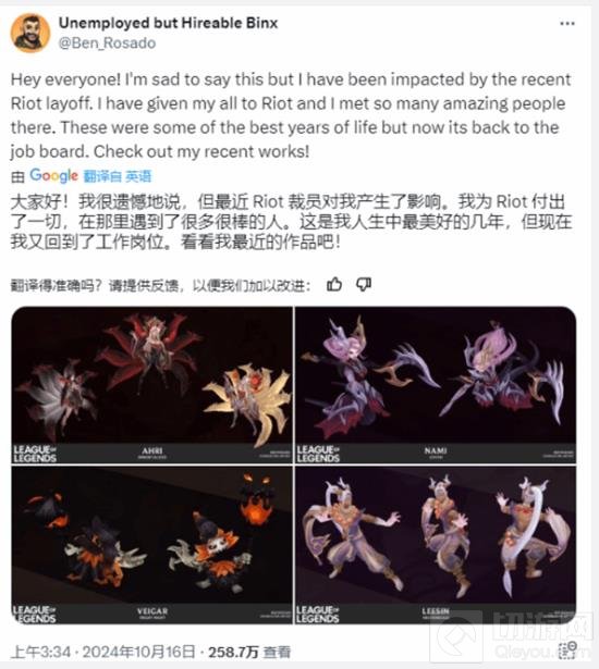 最近他在发文中说:“大家好!我很遗憾地说,但最近Riot裁员对我产生了影响。我为Riot付出了一切,在那里遇到了很多很棒的人。这是我人生中最美好的几年,但现在我又回到了工作岗位。看看我最近的作品吧!”
